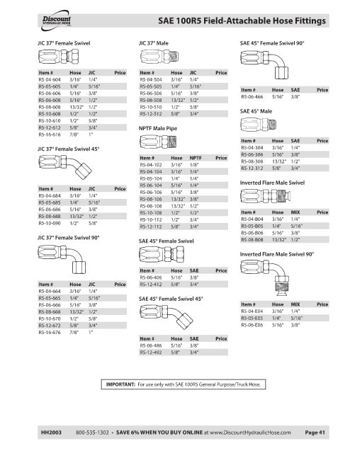 HH2003 800-535-1302 • SAVE 6% WHEN YOU BUY ONLINE at www.DiscountHydraulicHose.com Page 41